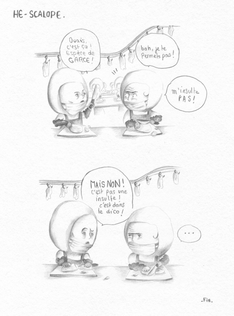 Après avoir travaillé à l’usine de brochettes, un été, je suis revenue avec plein d’anecdotes. C’était évident, il fallait que je les dessine. Ce petit livre « Les dindes aux brochettes » a été réalisé pour l’exposition « Débauche(s) » qui s’est déroulée à Nantes en 2012. Il est composé de petites histoires qui se déroulent en deux pages et d’une grande au milieu du livre.